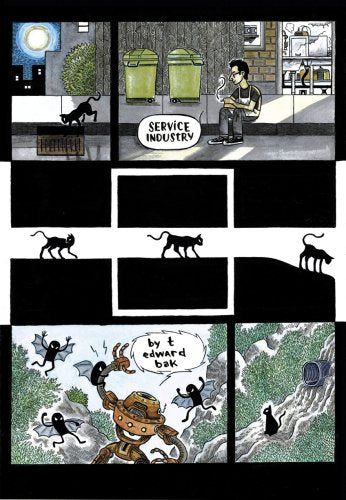The autobiographical SERVICE INDUSTRY appeared in the local arts newsweekly FLAGPOLE MAGAZINE (Athens, GA) from 2002-2005. SERVICE INDUSTRY documents travel and working and dreams and failures and heartbreak and love and misery and madness, inquiring about the process of life and human liberty. A soulful exploration into what drives an artist, Bak's restlessness is fueled by a naïve enthusiasm for punk rock music and the Beat writers.