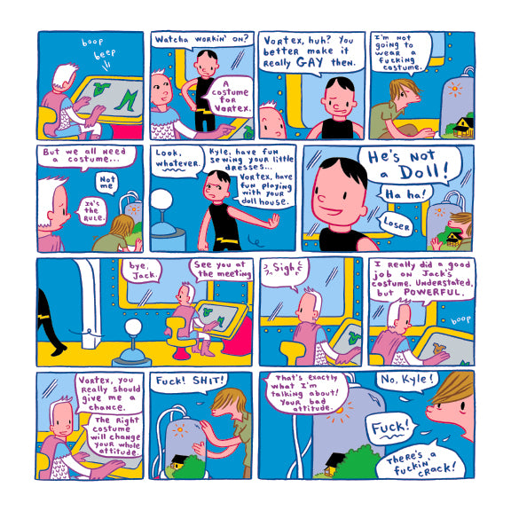SuperF*ckers collects all four fan-favorite issues of James Kochalka’s beloved series, plus the all-new Jack Krak one-shot! Foul-mouthed, filthy-minded, and completely oblivious, these young “heroes” do everything BUT fight crime – they’re too busy getting high, hazing the new kids, playing video games, scheming to be team leader, and designing new costumes.