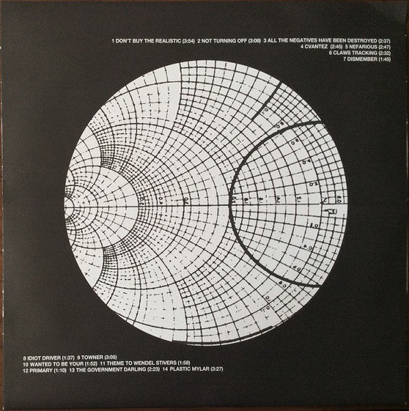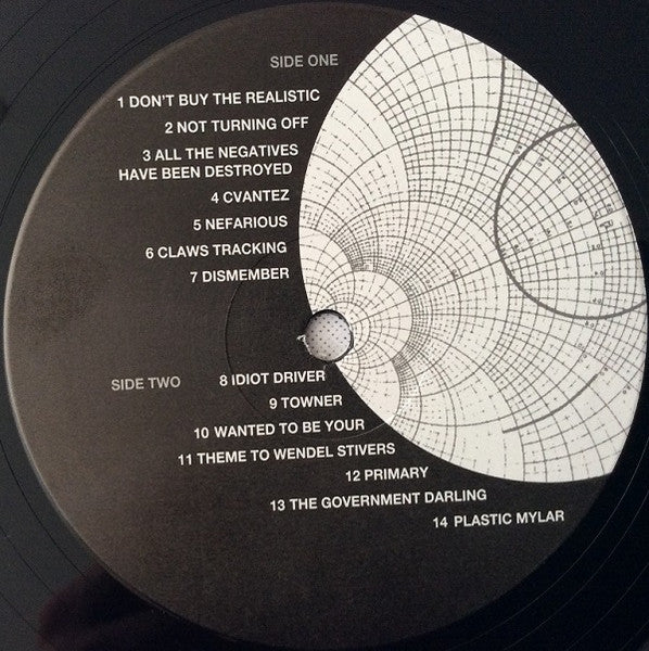 Tracklist: A1. Don't Buy The Realistic, A2. Not Turning Off, A3. All The Negatives Have Been Destroyed, A4. Cvantez, A5. Nefarious, A6. Claws Tracking, A7. Dismember, B8. Idiot Driver, B9. Towner, B10. Wanted To Be Your, B11. Theme To Wendel Stivers, B12. Primary, B13. The Government Darling, B14. Plastic Mylar