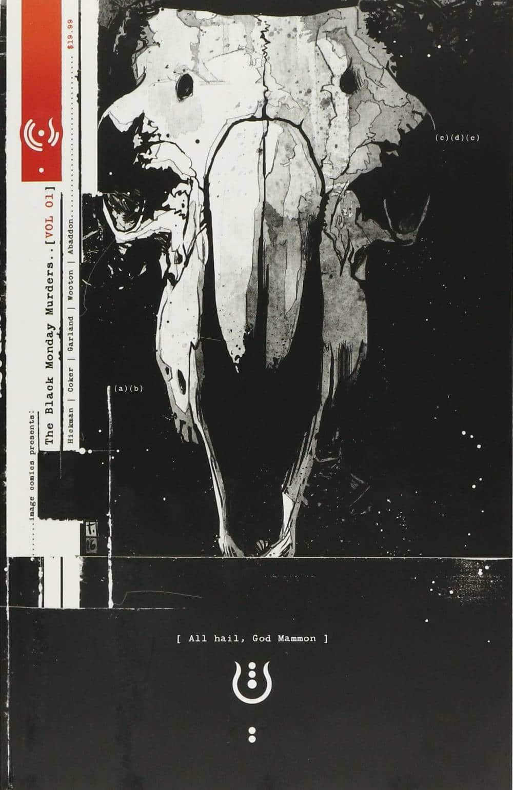 “MAMMON” ALL HAIL GOD MONEY! From Jonathan Hickman (East of West, Secret Wars, Avengers) and Tomm Coker (Undying Love) comes a new crypto-noir series about the power of dirty, filthy money... and exactly what kind of people you can buy with it. The Black Monday Murders is classic occultism where the various schools of magic are actually clandestine banking cartels who control all of society: a secret world where vampire Russian oligarchs, Black popes, enchanted American aristocrats, and hitmen from the International Monetary Fund work together to keep ALL OF US in our proper place. Collects The Black Monday Murders #1-4.