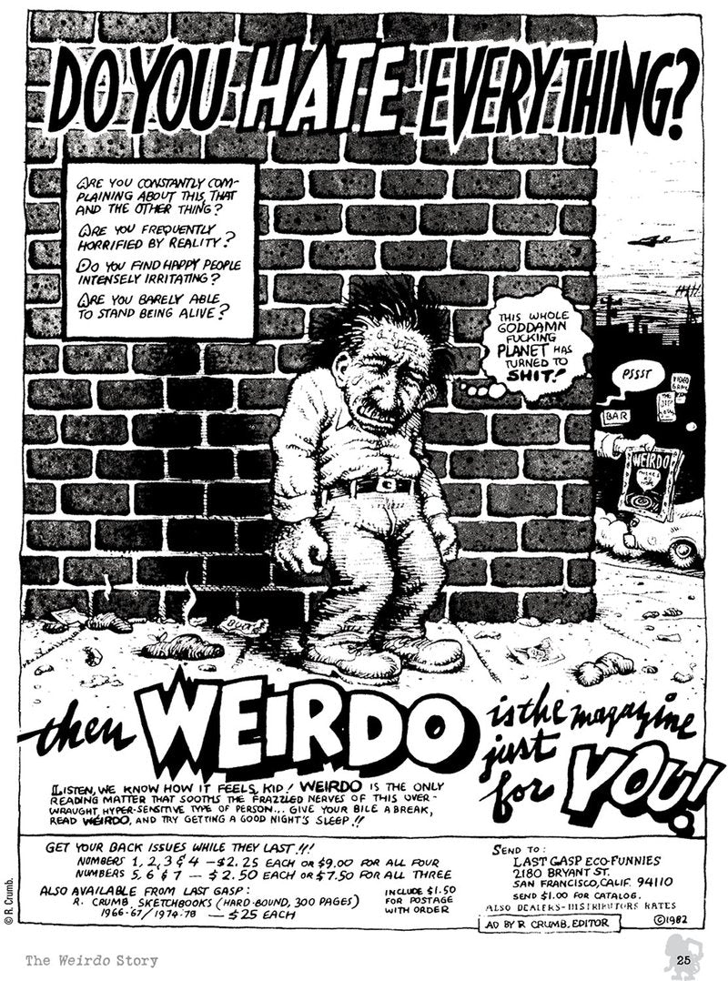 In 1981, amidst a seismic shift to the right in the country, Crumb responded by unleashing the savagely irreverent and satirical Weirdo onto the great multitude, and he generously welcomed to its pages not just his ZAP Comix underground cohorts, but also an entirely new generation of iconoclastic cartoonists. It was an irreverent, outrageous, often politically-incorrect, and taboo-challenging anthology that showcased Crumb's finest ? and most controversial ? material. It was gut-busting, hysterical, and frequently offensive. But, most of all, it was FUNNY! Though it finally gave up the ghost by 1993, in its time, Weirdo was one of the very best of its kind… a showcase for outsiders, freaks, and (naturally) weirdos. In fact, truth to tell, it’s the ONLY one of its kind!