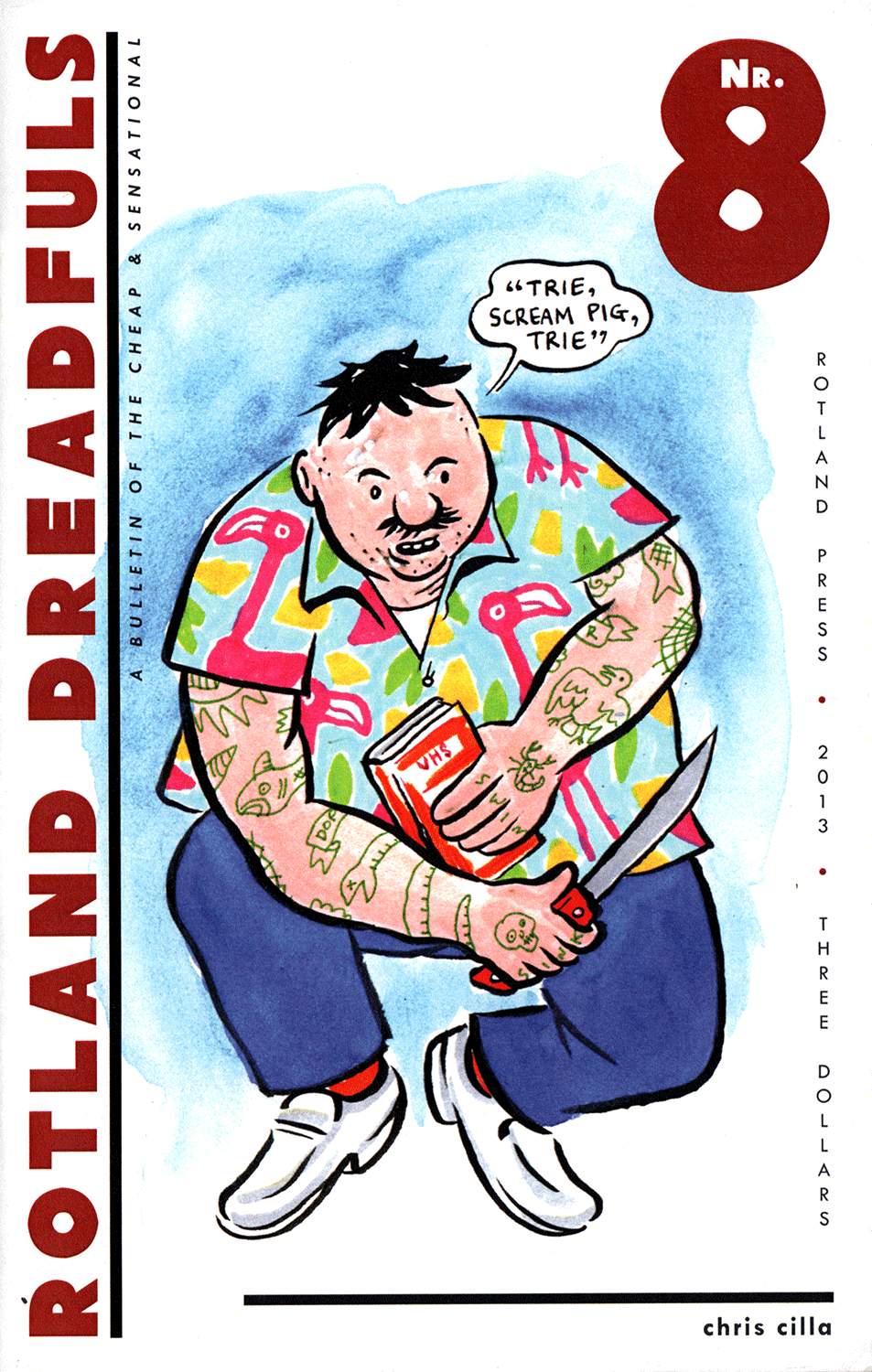Chris C. Cilla is a cartoonist and screenprinter. His full length book The Heavy Hand was published by Sparkplug Comic Books in 2010. His work has been featured in the anthologies Kramers Ergot, Barf Water, and Bog Witch. He has been publishing minicomics since 1987.
