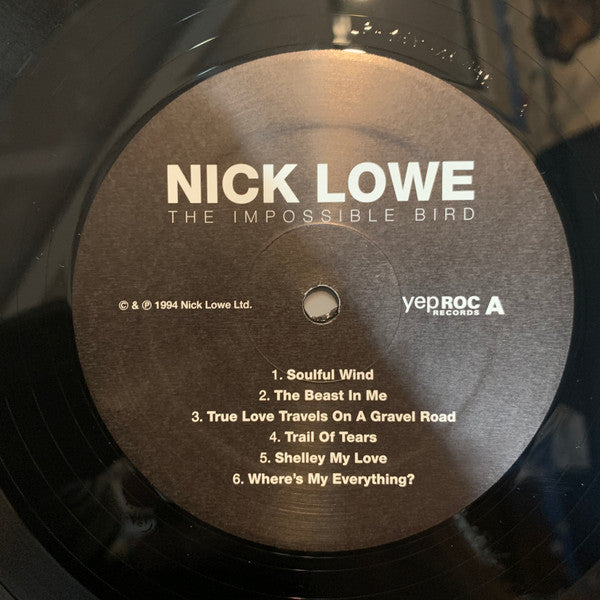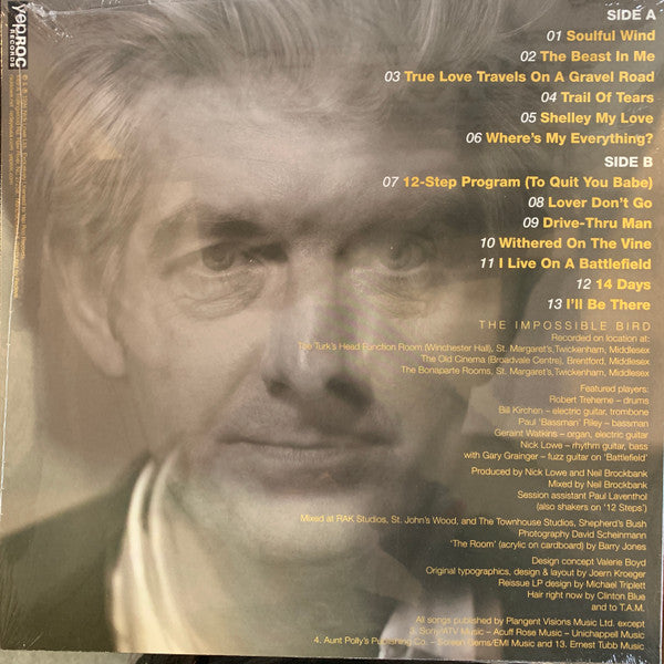 Lowe's 1994 The Impossible Bird is a low-key, easy-going album which has a lot more to do with 1956 country music than with his '70s punk roots. Nonetheless the 13 songs--10 Lowe originals and three country chestnuts--are marked by the sort of no-frills arrangements and unpretentious passion that made pub-rock so special in the first place. When Lowe sings a ballad such as "The Beast in Me," "Withered on the Vine," and "Lover Don't Go," the arrangements are so minimalist--just a hint of guitar and drums behind the organ--that the song lives or dies by the vocal. Fortunately, Lowe pulls off the difficult trick of sounding lonely and desperate without sounding self-pitying. Whether it's a tongue-in-cheek rocker such as "12-Step Program (To Quit You Babe)" or one of the many ballads, Lowe hits the mark. The 2021 reissue of The Impossible Bird is newly remastered from the original tapes.