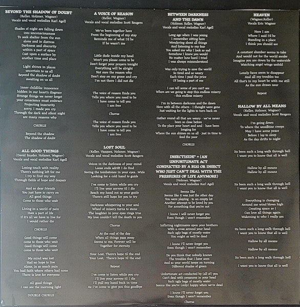 Tracklist: . Side A, 1. Beyond The Shadow Of Doubt, 2. All Good Things, 3. Lost Soul, 4. A Voice Of Reason, . Side B, 5. Between Darkness And Dawn, 6. Insectiside, 7. Heaven , 8. Hallow By All Means