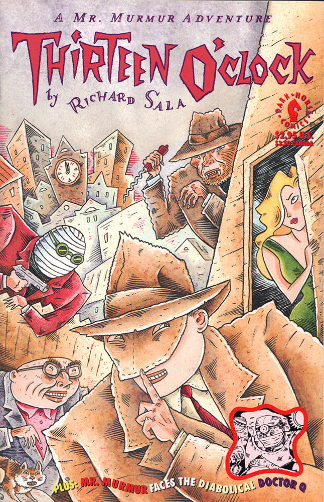 You've seen his fevered visions in the pages of Raw, Blab, and Buzz, and his animated serial "Invisible Hands" mesmerized a nation of viewers on MTV's Liquid Television. Thirteen O'Clock collects the exploits of Sala's mysterious figure of the night Mr. Murmur from Deadline U.S.A., along with new Murmur material seen nowhere else on this planet! Follow Sala's masked avenger as he descends into the city's stygian depths to unlock the unholy secrets behind the Corkscrew Murders! Join Mr. Murmur, Eve E. Vee, The Wheezer, Lt. Sedan, Dr. Verlorene, and the head of Zolok in this tableau of dread, death, and darkness!