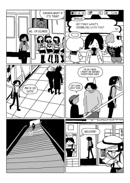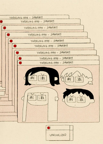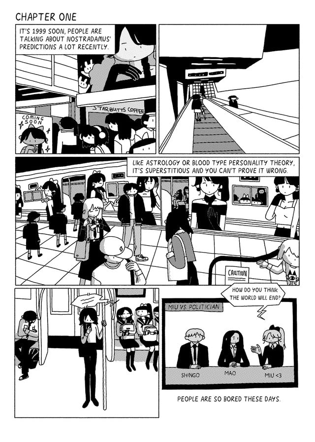 1999 is almost here. The end of the world hangs in the air. Everyone is talking about it... and dreaming about it, even the biggest pop idol Miu. Meanwhile, Maki, Ren, and Lewis all have the same dream: a bizarre demon corporation runs an interdimensional TV station. Every TV show is a different world. Is this more than just a dream? Are we a TV show on the verge of being cancelled? And what does the idol Miu have to do with it? Why are there two moons all of a sudden? Thrilling 1999 — Simone Zheng's debut mini comic — is a surreal mystery reminiscent of Murakami Haruki. A pulp hyperobject. A tip of an iceberg.