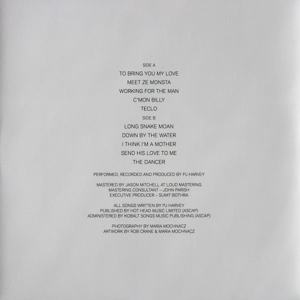 Tracklist: A1. To Bring You My Love, A2. Meet Ze Monsta, A3. Working For The Man, A4. C'mon Billy, A5. Teclo, B1. Long Snake Moan, B2. Down By The Water, B3. I Think I'm A Mother, B4. Send His Love To Me, B5. The Dancer