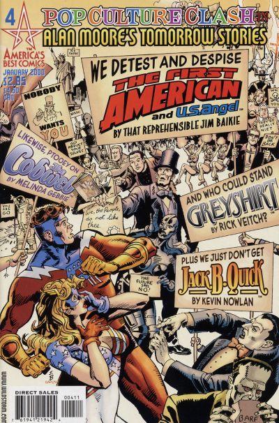 Written by Alan Moore; art by Kevin Nowlan, Rick Veitch, Jim Baikie, and Melinda Gebbie; cover art by Jim Baikie. Beneath a madly satirical cover from Jim Baikie is another four-decker farrago of fun, fear, and fantasy! Greyshirt crosses the fated path of a time-traveling transgressor in "Tempus, Fugitive!"; and First American finds himself accused of scandal, sleaze and much worse in "The Bitter Crumbs of Defeat." Meanwhile, over in Queerwater Creek, Jack B. Quick continues his one-boy war against the laws of basic common sense; and in Indigo City, we peruse the pediatric perambulations of "Li'l Cobweb."