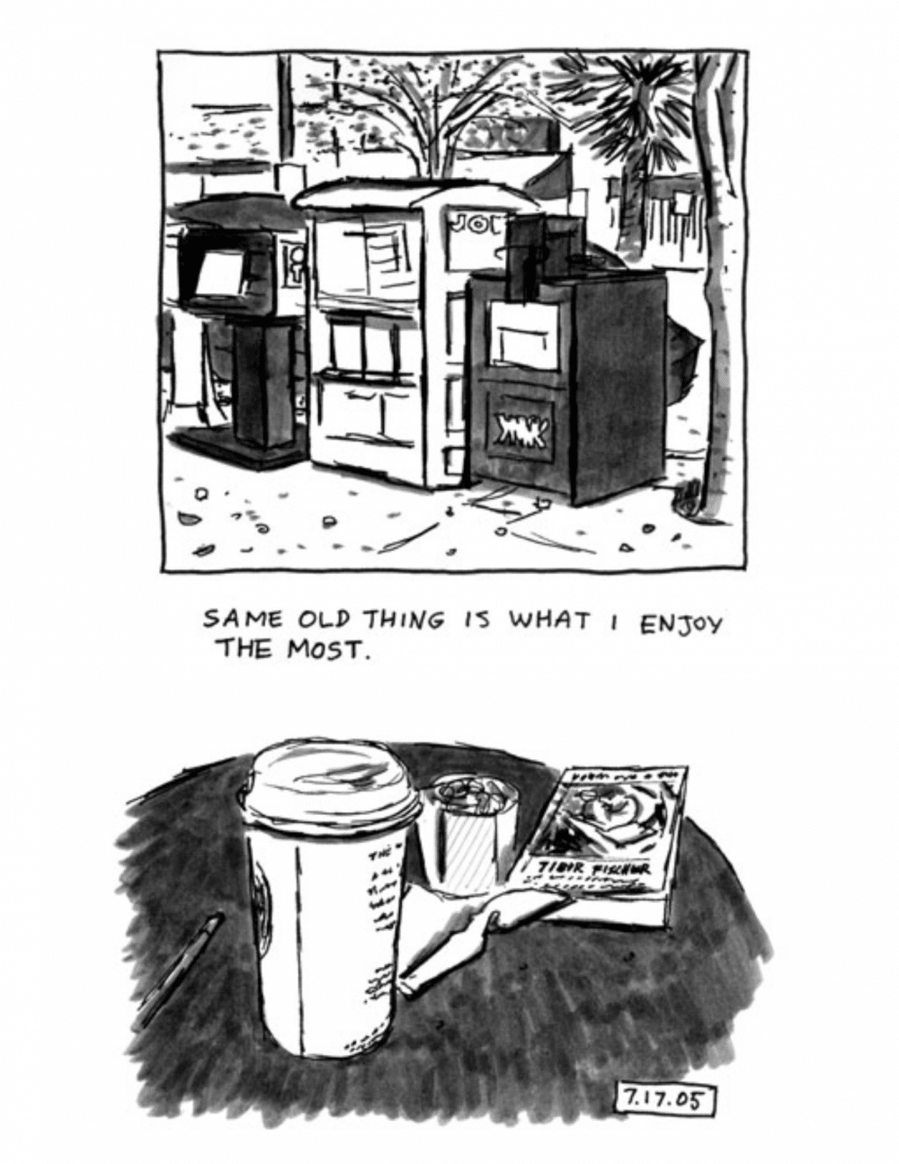 “In the third issue of Watching Days Become Years the comics were drawn in California, between San Francisco and Los Angeles. The focus (as always?) is on the passage of time, on family, friends, books, music, movies, beaches, airplanes, boats, love and hate. The artwork is loose, immediate and lively, drawn in the nice, gray pen-and-ink wash I’ve been working in for the last few years. Hopefully it’s also a comic book that will provide some laughs.” -- Jeff Levine