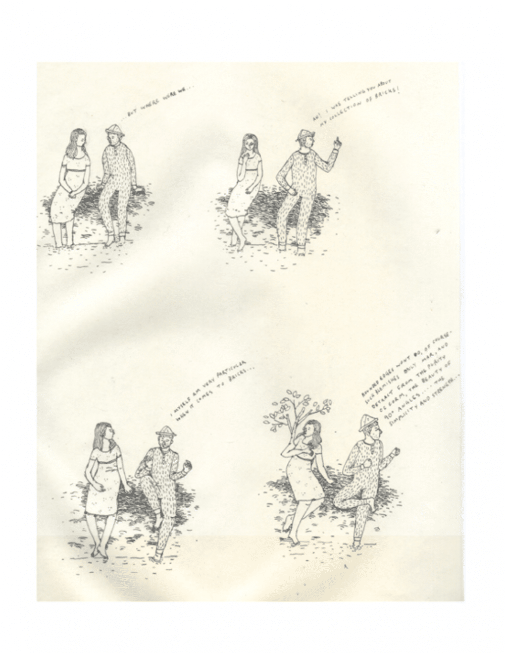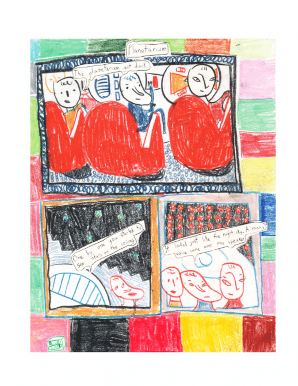 โFrancis goes to school and meets a boy. He bikes home with her. He sees her house. Heโs condescending but charismatic too. They throw a dinner party. Francis tries to make it seem like she has a lot of friends. Austin goes to the planetarium with his dad. He remembers the light changing. Then he goes to the movies with his mom. They drive home together. Two people break up. One of them starts a new relationship but canโt sustain it. Dylan talks about Alex Toth. Lis draws a beautiful table of contents. A boy sits absentmindedly while a girl turns into a tree. John and Onsmith share artistic reference points. Juliacks says goodbye.โ